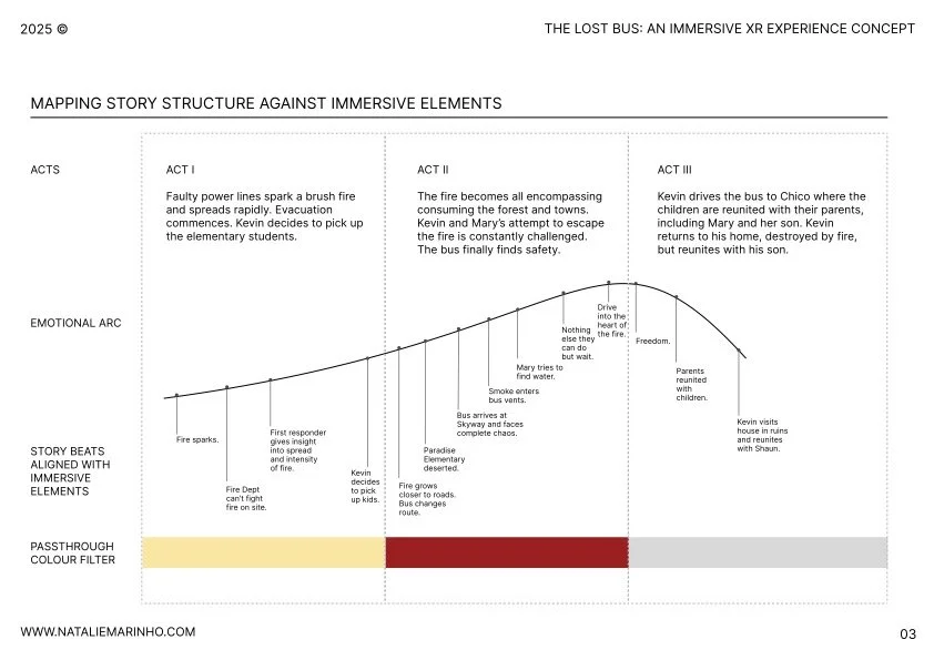 I mapped the film’s 3-act structure with the main story beats (potential immersive anchors) and overall emotional arc which gave me the idea of introducing a specific colour palette for each act via a passthrough colour filter (see image below).